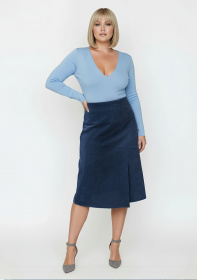 Юбка из вельвет трапециевидного-силуэта, на передней части асимметричная шлица. Поперечные, косые подрезы украшают юбку.